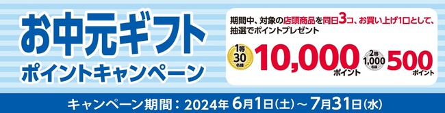 条件:期間中、対象の店頭商品を同日3コ、お買い上げを1口として、抽選でポイントプレゼント