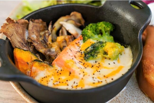 秋のうまみがたっぷりのサーモンやキノコ、野菜たちをホワイトソースでグリルしました。