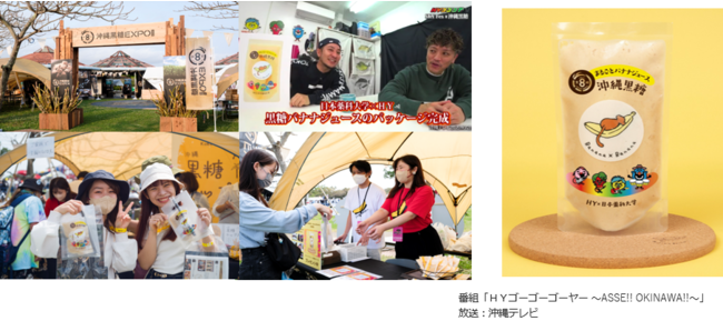 3月18日~19日に開催された「HY SKY Fes 2023」の「沖縄黒糖EXPO」のブースにて、日本薬科大学の学生考案のパッケージデザインとHYメンバーのイラストが入った沖縄黒糖バナナジュースの試作品を無料配布しました。前夜祭では、HYメンバーが沖縄黒糖バナナジュースについて話してくれていたこともあり、多くの方が興味を持ってくだり、実際に飲んだ方からは「おいしい」「もっと飲みたい」「購入したい」といったうれしいお声をいただきました。