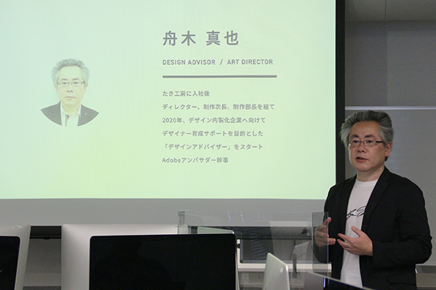 講義テーマは「デザイナーに必要な資質」。国内外で豊富な経験を持ち、Adobeアンバサダー幹事も務める舟木氏から、業界事情やデザイナーとして働いていく上で必要なことを教わりました。
