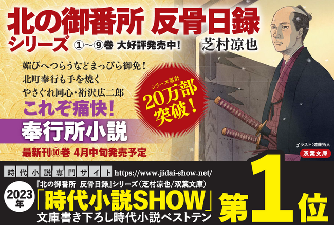 時代小説を紹介しているwebサイト『時代小説SHOW』が、2023年に発売された作品の年間ベスト10を発表。芝村凉也の「北の御番所 反骨日録」シリーズが[文庫書き下ろし]部門で第1位を獲得した。