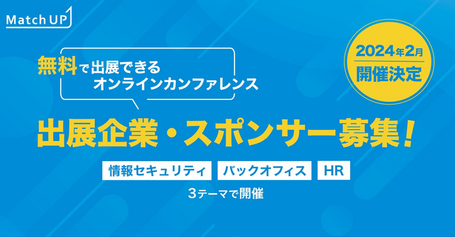 本カンファレンスは、「Match UP」リリース1周年を記念した特別企画として、情報セキュリティ、バックオフィス、HRの3テーマで開催します。出展費用は無料、出展企業さま同士で相互集客し合う新しい形のカンファレンスです。