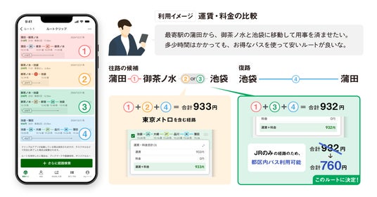 本機能によって、これまで画面やタブを切り替えて見比べる手間や、各ルートの運賃・料金を別途合算する作業を省くことができます。複数の移動ルートを検討して旅程を考えられる方や、割引乗車券を使うかどうか検討されたい方など、便利にご利用いただけます。