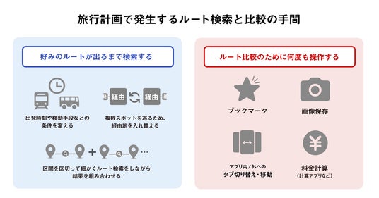 旅行計画等では、一度のルート検索で提案されるルートをそのまま使用するとは限らず、好みのルートが出るまで条件を変えて何度か検索する場合があります。しかし検索の度に結果をブックマークや画面保存し、タブを切り替えて見比べる操作を繰り返すため、手間や時間がかかってしまうこともあります。