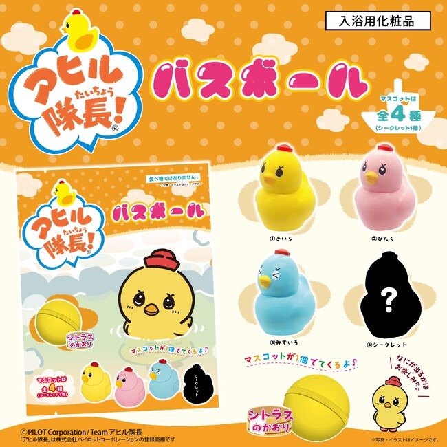 バスボールを湯船に入れると、シトラスの香りと鮮やかな黄色が湯船に広がります。入浴料が溶け終わると中からランダムで「アヒル隊長」のフィギュアがひとつ出てきます。いろいろな色のアヒル隊長は表情も豊か。シークレットのフィギュアは……!?何が出るかはお楽しみです。