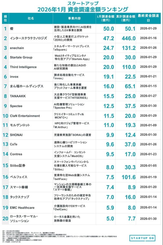 ・レポート記事:STARTUP DB (https://journal.startup-db.com/articles/funding-ranking-202601)