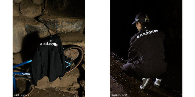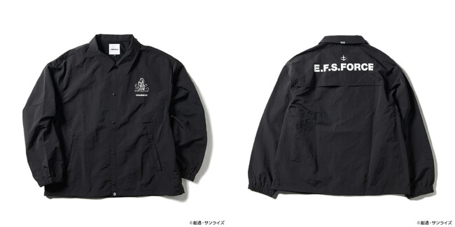 胸に、CHARI&COロゴとガンダムRX-78-2のシルエットをあしらい、背中に風通しとなるベンチレーション機能を有したストームシールドに”E.F.S.FORCE”のロゴがプリントされた、スポーティなコーチジャケット。襟裏にはリフレクターテープがあしらわれています。