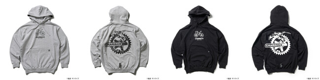 バックに自転車のクランクパーツと、ガンダムRX-78-2を大胆に掛け合わせたデザイン、フロントに、本コレクションのコラボロゴを施したデザインのフーディ。フード着用時に、左右の視野を広げるベルトを装着、背中の裾にはリフレクターテープがあしらわれています。
