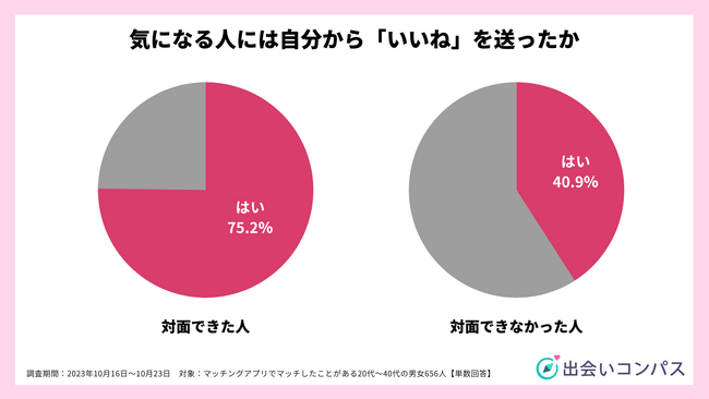 アプリ上で気になる人を見つけた際、自分から積極的にいいねを押したかどうかを質問した結果、押したと回答した人は、対面できた人で75.2%、対面できなかった人は40.9%でした。