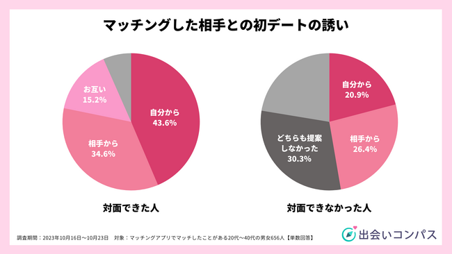初デートの約束を自分から提案したかどうかを聞いてみた結果、自分から誘った割合は対面できた人が43.6%、対面できなかった人は20.9%でした。