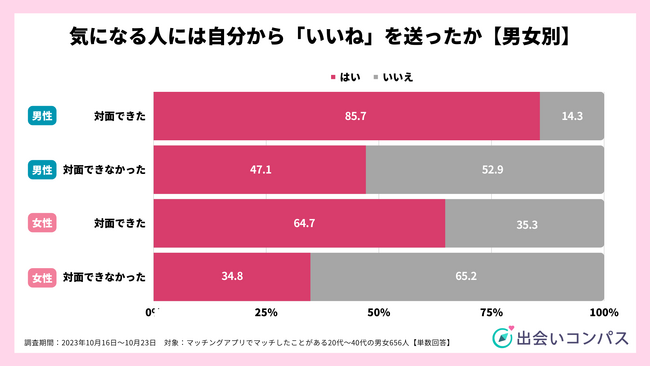 マッチングアプリで相手と会うに至らなかった人は、会えた人と比較して「いいね」を自分から送った割合が約半分となっています。