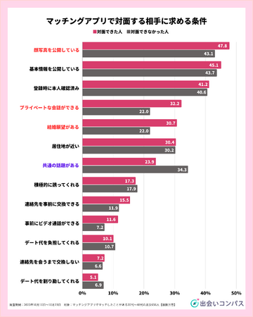 続いて、マッチングアプリで対面する相手に求める条件を聞いてみると、対面できた人/できなかった人ともに、TOP3は「顔写真を公開している」「基本情報を公開している」「サービス登録時に本人確認済」でした。