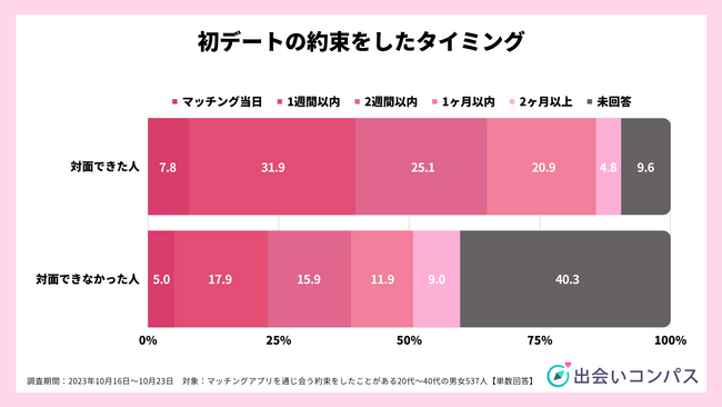 マッチングした相手と初めて会う約束をしたタイミングを聞いたところ、対面できた人は「1週間以内(31.9%)」が最も多く、次いで「2週間以内(25.1%)」でした。