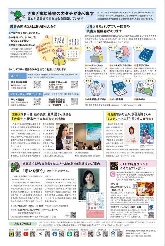 徳島県では、さまざまな読書のカタチを知ってもらい、障がいの有無にかかわらず、すべての人が読書を楽しめる環境づくりを推進するため、公立図書館や点字図書館、福祉機関等と連携した取組を行っています。