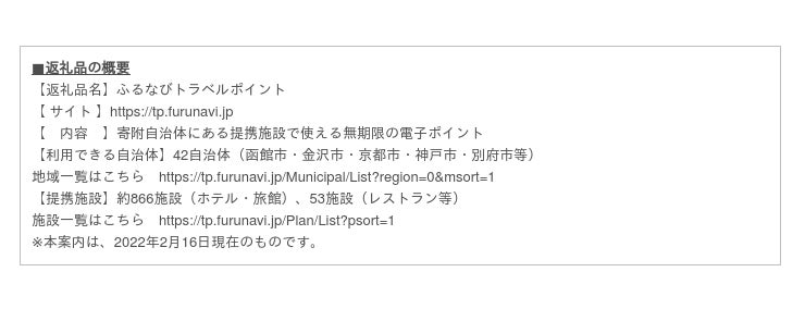 寄附者が旅行したい自治体を、ふるなびトラベルから選び寄附する事により、その自治体内の提携施設(ホテル・旅館)で共通して使える電子ポイントが返礼品として即時付与されます。旅行券・宿泊クーポンとは異なり「有効期限が無期限」となっており、800を超える提携施設で手軽に利用ができる電子ポイントの利便性の高さが、寄附者レビューでも多く評価を頂いている返礼品となります。