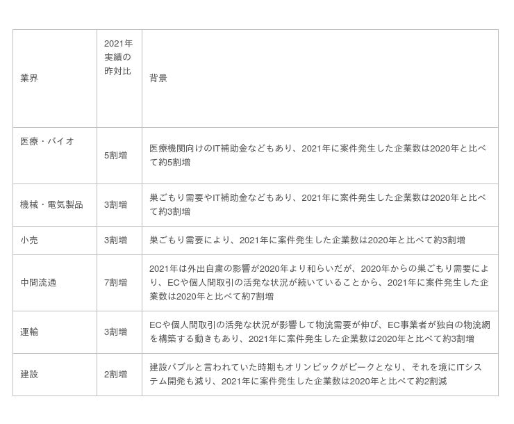 2021年昨対比で、3割以上案件が発生した企業数が増えている業界は「医療・バイオ」「機械・電気製品」「小売」「中間流通」「運輸」となりました。一方で、東京オリンピックが終わった影響を直に受けた「建設」は約1割減となっています。