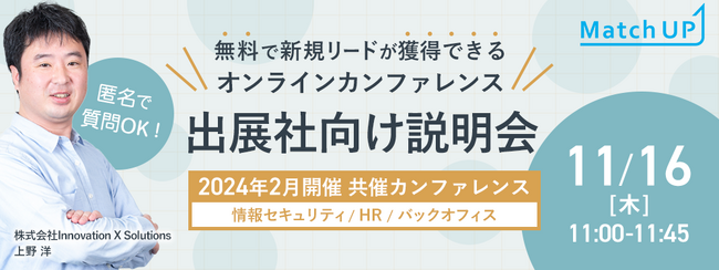 株式会社イノベーション(東証グロース 証券コード3970)のグループ会社である、株式会社Innovation X Solutions(本社:東京都渋谷区、代表取締役社長:遠藤俊一、以下「Innovation X Solutions」)は、2023年11月16日(木)に開催される「匿名で質問OK!無料で新規リードが獲得できるオンラインカンファレンス出展社向け説明会」をテーマとしたセミナーを開催します。