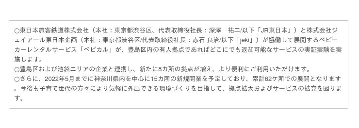※1 実証実験の対象貸出場所は記載の8カ所(有人)になります。JR池袋駅に設置しているベビカルスタンド(無人貸出機)は対象外となり、JR池袋駅ベビカルスタンド(無人貸出機)への返却は出来ません。