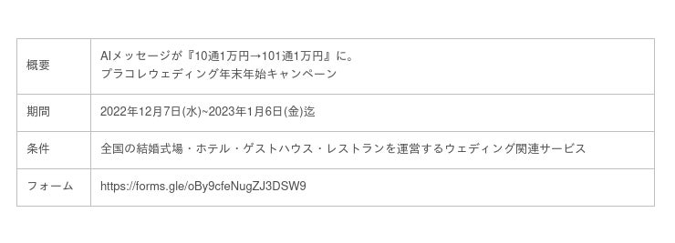 7周年を迎えたプラコレウェディング。会員登録数が12万組を突破したプラコレウェディングで、結婚式探しをする新郎新婦が増える年末年始シーズンに1人でも多くの新郎新婦様に選択肢を与え、理想の結婚式に出会っていただくために今回のキャンペーンを実施致します。プラコレウェディングでは、AIメッセージ(オリジナルメッセージ)を活用して直接お客様に対してアプローチをすることが可能です。この機会にAIメッセージを活用して効率的にお客様に直接アプローチを行いませんか?