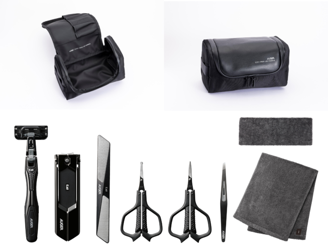 「AUGER」のシステムカミソリ、ツメキリM Revolver、ネイルファイル、オシャレハサミ、セーフティハサミ、毛抜き、ヘアバンド、タオルと、それらを全て収納できる「5351POUR LES HOMMES」のオリジナルポーチの計9アイテムがセットになって登場いたします。