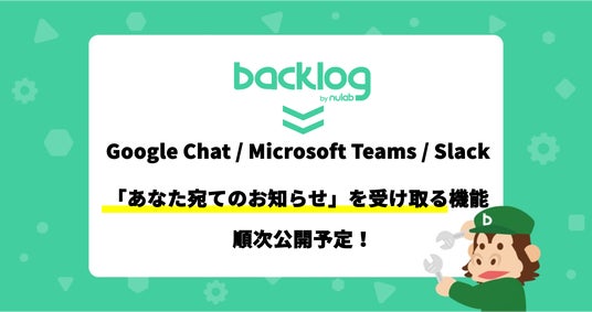 株式会社ヌーラボ(本社:福岡県福岡市、代表取締役:橋本正徳、以下 ヌーラボ)が提供しているプロジェクト・タスク管理ツールの「Backlog」は、現在も連携機能を提供しているGoogle Chat、Microsoft Teams、SlackにBacklogの更新情報等を通知する機能の強化を開始し、Backlogの「あなた宛てのお知らせ」を各チャットで受け取る機能を今後順次公開予定です。
