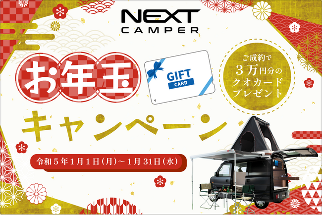 株式会社ブレイズ(愛知県名古屋市、代表取締役:市川秀幸、以下ブレイズ)は、2024年1月1日(月)~1月31日(水)の期間、軽キャンピングカーキット「NEXT CAMPER(ネクストキャンパー)」をご契約いただいたお客様に、もれなくクオカード3万円分をプレゼントする「お年玉キャンペーン」を実施いたします。