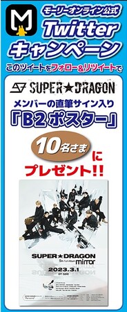 限定商品の展開を記念し、モーリーオンライン公式Twitterでは「メンバーの直筆サイン入りポスター」が当たるプレゼントキャンペーンを開催いたします。また、期間中当社が運営するアミューズメント施設モーリーファンタジー・PALOにおいて『SUPER★DRAGON』のメンバーの限定メッセージを放送いたします。