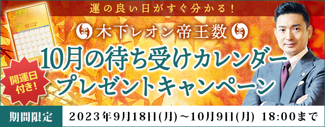 テレシスネットワーク株式会社(本社:東京都港区、代表取締役:鷹石惠充 https://www.telsys.co.jp/)は、2023年9月18日(月)より、月額公式サイト『木下レオン◆帝王数』にて、その月の開運日が分かる『10月の待ち受けカレンダープレゼント』キャンペーンを公開いたしました。