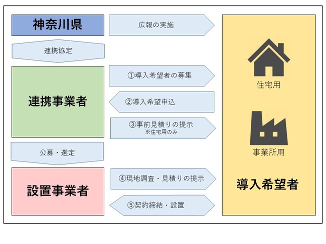 神奈川県では、太陽光発電の導入拡大を図るため、平成31(令和元)年度から、民間事業者と連携して「太陽光発電の共同購入事業」を実施しています。この度、住宅用及び事業所用事業において、令和6年度から8年度まで連携する新たな民間事業者(以下「連携事業者」という。)を決定し、協定を締結しました。