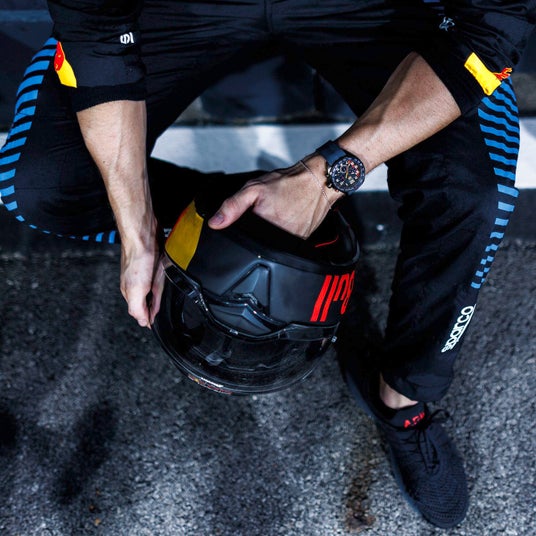 オラクル・レッドブル・レーシングを象徴するカラーリングに着想を得たこの時計は、ダークブルー、イエロー、レッドブルの象徴的なレッドが絶妙なコントラストを演出。ビビッドで大胆な色使いがこのクロノグラフを際立たせ、機能面だけでなくデザインも人目を引く印象的なモデルに仕上がっています。