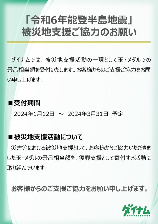 また、ダイナム全店舗(399店舗)にて、玉・メダルによる寄付募集を開始することをお知らせいたします。