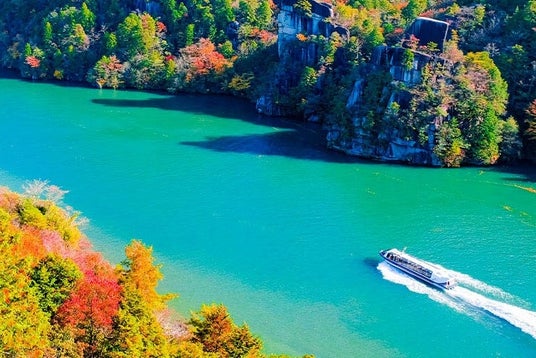 ホテルから車で約50分、日本百景にも選ばれた岐阜県の景勝地の「恵那峡」は例年11月上旬~下旬になると渓谷が色づき紅葉を楽しむことができます。木曽川をせき止めて作ったダムの建設によってできあがった湖となっており、遊覧船に乗って周遊する「恵那峡巡り」がおすすめです。