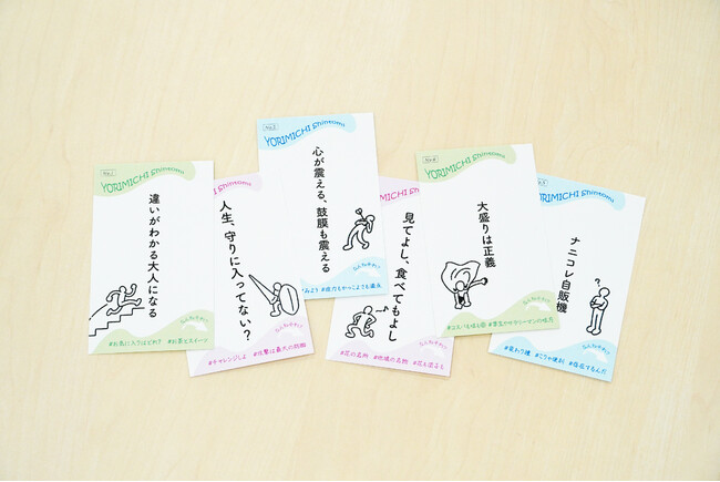 二川さんが作成した「寄り道しんとみカード」は全12種。表面には「違いがわかる大人になる」「人生、守りに入ってない?」など、一見すると不思議なワードが書かれていますが、裏にはそのワードに沿ったスポットが3~4つ紹介されているというもの。テーマごとに新富町のおすすめスポットを紹介したカードです。