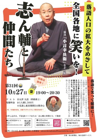 毎日新聞社は10月27日(金)午後7時から、オンライン落語会「志ん輔と仲間たち」をインターネットでライブ配信します。演目は「小言幸兵衛」など2席。将棋棋士の田丸昇九段がゲスト出演します。