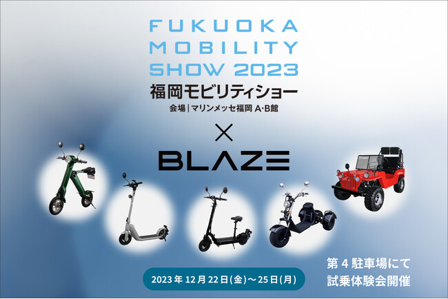 株式会社ブレイズ(愛知県名古屋市、代表取締役:市川秀幸、以下ブレイズ)は、2023年12月22日(金)~25日(月)の4日間、マリンメッセ福岡で開催される「FUKUOKA MOBILITY SHOW 2023(福岡モビリティショー2023)」に、加盟する「JEMPA(一般社団法人日本電動モビリティ推進協会)」ブースにて出展することお知らせします。