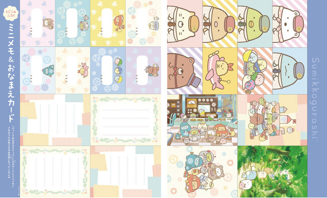 「ミニメモ」の裏面はぬりえのお手本に。「おなまえカード」は付録の「すみっコとおそろい♪ぷっくりおなまえクリップ」に入れると、表紙にのっているようなクリップに。推しすみっコを入れてみんなに自慢しちゃおう♪
