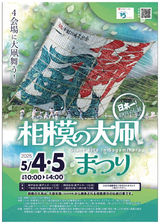 神奈川県相模原市では、約190年もの歴史を誇る地域の伝統行事で、今や市内外の皆さんからゴールデンウィークの風物詩として親しまれている「相模の大凧まつり」を、令和7年5月4日(日・祝)、5日(月・祝)の2日間、相模川新磯地区河川敷4会場にて開催します。