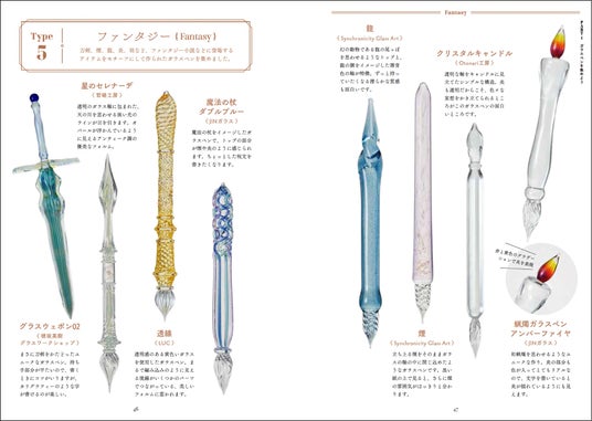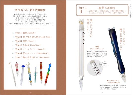 〈ガラスペン タイプ別紹介〉Type1 動物(Animals)/Type2 食べ物&飲み物(Foods & Drinks)/Type3 自然(Nature)/Type4 月&星(Moon & Star)/Type5 ファンタジー(Fantasy)/Type6 形がユニーク(Unique shape)/Type7 軸の色を楽しむ(Shaft Series)/ガラスぺンの保管方法