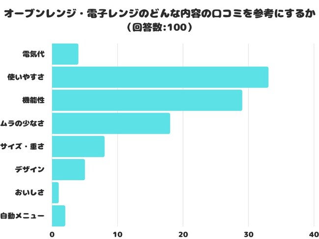 オーブンレンジ・電子レンジのどんな内容の口コミを参考にするかをアンケートにて調査したところ、1位は「使いやすさ」 でした。