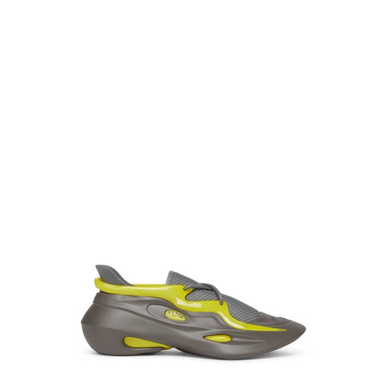 メゾンのメンズフットウェアの先進的なスタンスを継承するスリップオンスニーカーは、オーガニックなインジェクションソールと、アッパーにはツートンカラーのバブルディテール、そしてメタリックアクセントがフィーチャーされています。低めのフラットなその輪郭は、人間工学的、そして空気量学的なデザインを生み出しています。ミニマルなストレッチシューレースは、メッシュのタンの上の波打つアッパーに隠れ、「FENDI」ロゴは外縁の透明なバブルディテールの下にあしらわれています。ダブグレーにイエローのアクセント、ブラックにミッドナイトシェイディッドブルーのアクセント、そしてオフホワイトにシルバーのアクセントを効かせたカラーバリエーションが展開されます。