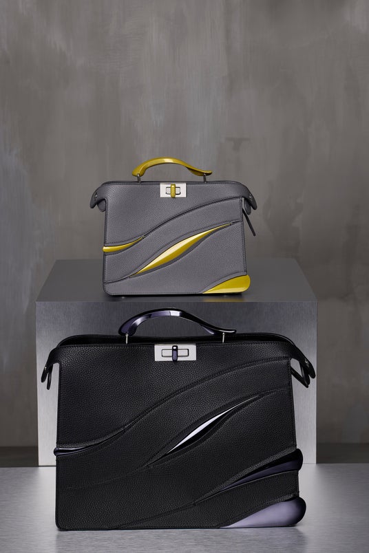 シルヴィア・フェンディとマ・ヤンソンのクリエイティブディレクションにより製作されたアイコンバッグ「ピーカブー アイシーユー」のファサードとハンドルは、MADの曲線的な建築スタイルへのオマージュとして、ニスをコーティングしたアルミニウムの輪郭を用いて脱構築されています。スムースレザーの表面は、波のようなフォルムにより分断され、バッグの右下隅まで続く波紋のような連続的な動きを生み出しています。「クオイオ ローマ(Cuoio Romano)」のグレインレザーに光沢のあるブルーアルミニウムのインサートを施した、ブラック・オン・ブラックの「ピーカブー アイシーユー ミディアム(Peekaboo ISeeU Medium)」と、イエローアルミニウムのインサートを施したダブグレーの「ピーカブー アイシーユー スモール(Peekaboo ISeeU Small)」の2つのカラーバリエーションが展開されます。