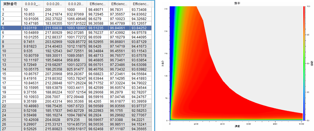 さらに、出力した効率マップ画像と結果の数値データをリンクさせて、リアルタイムで表示させることが可能となります。これによって画像だけでは分かりづらかった効率の値を確認しながら分析することを可能とします。