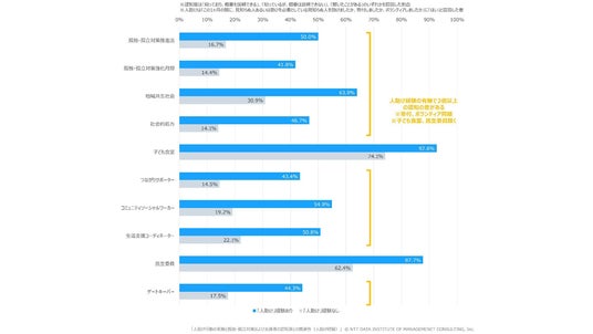 その結果、「人助け」「寄付」「ボランティア」を経験した人は、未経験の人に比べて孤独・孤立対策および支援者の認知度が約2倍高いことが明らかになりました(「子ども食堂」「民生委員」除く。図表4は人助け行動のグラフのみを掲載)。さらに、孤独・孤立に不安を有する人と日常生活で接する機会が「よくある」「時々ある」と回答した人は、孤独・孤立対策および支援者の認知度が高い傾向がみられました。これらの結果から、人助け行動や援助規範意識を持つ人々は、孤独・孤立対策および支援者に関する政策や施策への関心が高い可能性が明らかになりました。