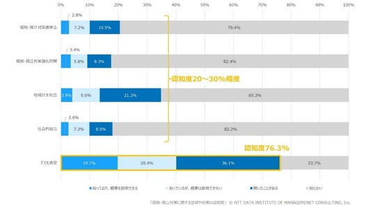 1. 孤独・孤立対策に関する法律や対策および支援者は、「子ども食堂」「民生委員」を除き十分に認知(※1)されていない