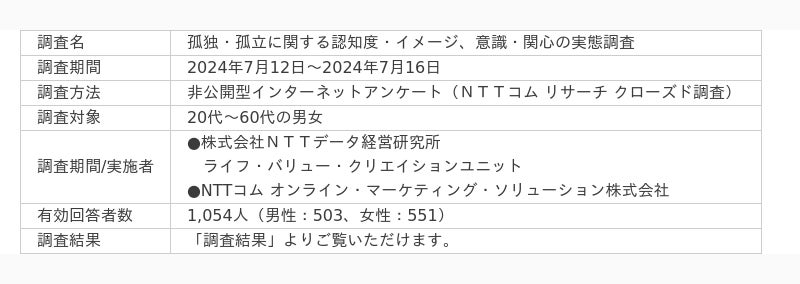 NTTコム オンライン・マーケティング・ソリューション株式会社(本社:東京都品川区、代表取締役社長:塚本良江、以下NTTコム オンライン)は、株式会社NTTデータ経営研究所(本社:東京都千代田区、代表取締役社長:山口 重樹、NTTデータ経営研究所)と共同で、NTTコム リサーチ登録モニターおよび協力企業を対象に「孤独・孤立に関する認知度・イメージ、意識・関心の実態調査」(以下、本調査)を実施しました。