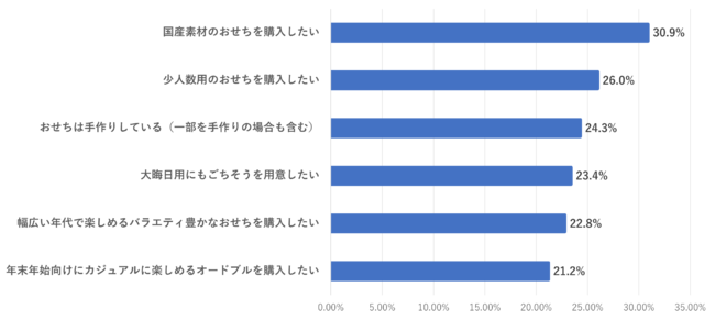 お正月や年末の料理は「国産素材のおせち」(30.9%)や「少人数のおせち」(26.0%)が人気。中には「大晦日用にごちそうを用意したい」「年末年始向けにカジュアルに楽しめるオードブルを購入したい」といった回答もそれぞれ約20%あり、伝統的なおせちに代わってごちそうやオードブルなどカジュアルな食事を準備される方も多いようだ。