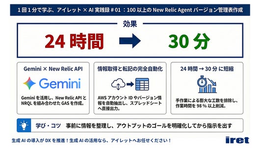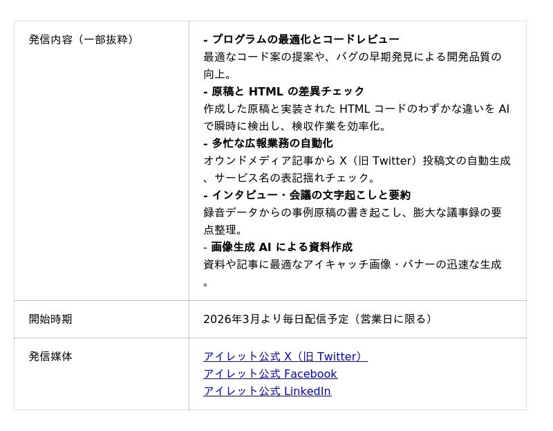 システム・アプリケーションの開発、グラフィック・UI/UX デザイン制作からインフラの構築・運用までをワンストップで提供するアイレット株式会社(本社:東京都港区、代表取締役社長:岩永充正、以下 アイレット)は、全従業員1,500人超を対象とした生成 AI 活用の組織標準化を加速させます。その一環として、現場で培われた AI 活用ノウハウを毎日発信する SNS 連載企画「アイレット × AI 実践録」を 2026年3月2日(月)より始動します。第1弾は本日17時に公開予定です。