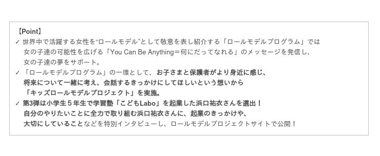 2016年より、日本でのロールモデルプログラムとして、毎年ロールモデルの方々のインタビューを公開しており、黒柳徹子さんや写真家の蜷川実花さん、プロテニスプレイヤーの大坂なおみさん、プロサーファーの松田詩野さんなどの各業界で活躍されている方々にご協力いただいています。また、2022年からは、この取り組みを保護者だけでなく、お子さまにとっても身近なものにするために、キッズロールモデルに登場していただき、「You Can Be Anything=何にだってなれる」のメッセージを伝え、夢や目標についての対話のきっかけになるコンテンツを発信します。