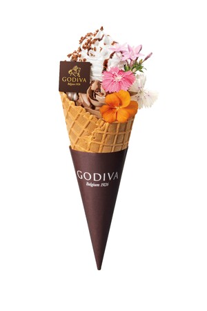 ゴディバのダブルチョコレートソフトクリームを、ホイップクリームとエディブルフラワーでアレンジした、フローラルな香りのパフェ風ソフトクリームです。