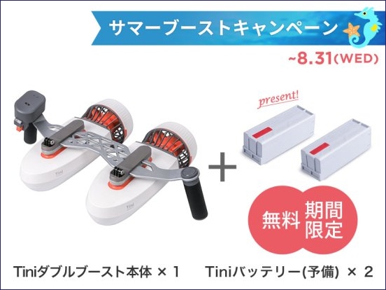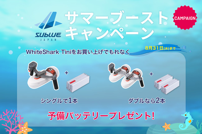 期間限定の Sublue サマーブーストキャンペーンでは、Amazon/楽天市場/PayPayモール(Yahoo)/セキドオンラインストア の各ECモール/サイトにて、水中スクーター「WhiteShark Tini(ホワイトシャーク タイニー)」本体をご購入のお客様を対象に、16,500円相当の専用予備バッテリーをプレゼントいたします。予備バッテリーは、単体でお使いいただく「シングルブースト」1台につき1本、シングル2台としても、2つのモーターを1つに合わせてよりパワフルにも楽しめる「ダブルブースト」は1台につき2本プレゼントいたします。1本あたり最大45分利用可能ですので、水中スクーターを使ったウォーターアクティビティを存分に楽しめるお得なキャンペーンです。